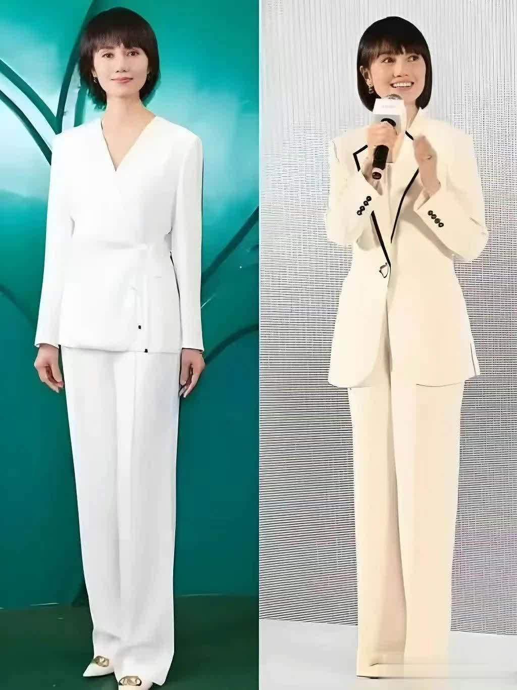 再看袁泉搭配阔腿裤,她穿的是一条白色的西装阔腿裤,裤子长度到脚面,面料挺括,显得特别干练。